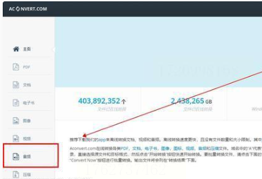用浏览器(Chrome、Edge都可以)访问aconvert官网,输入网址后进入。在首页左侧的功能栏里,找到“音频”分类,点击进入音频转换页面。