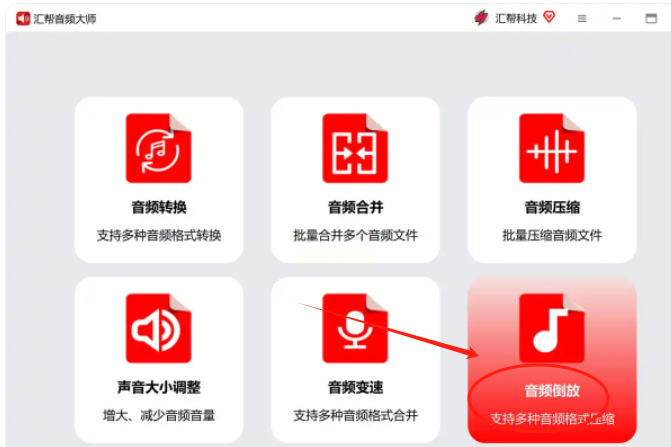 首先,在电脑上启动"汇帮音频大师"软件。进入软件主界面后,在功能区域找到"音频倒放"选项。这个选项通常位于界面左侧的功能列表或顶部菜单栏中,图标设计得很直观,很容易辨认。
