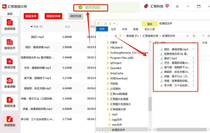 当所有进度条都显示为100%时,表示处理完成。软件会自动打开输出文件夹,方便你查看处理好的倒放音频。