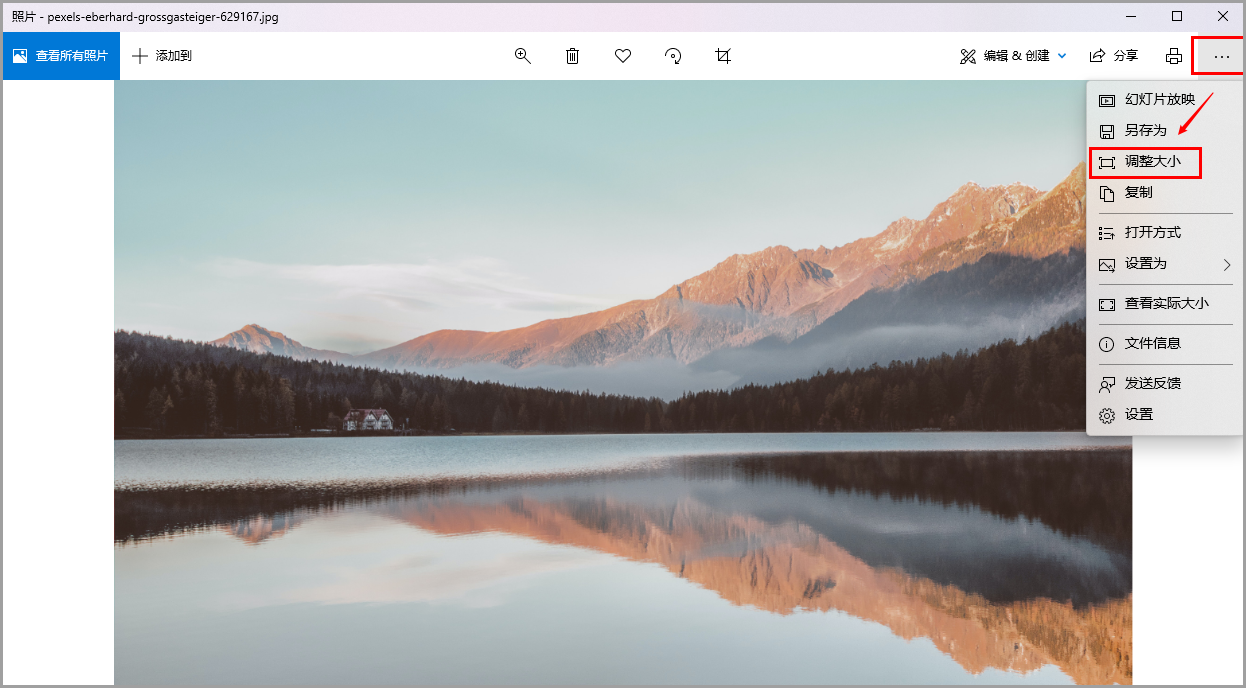 步骤三:用“照片”应用打开图片后,留意窗口的右上角,点击那三个小点(…)的菜单按钮。