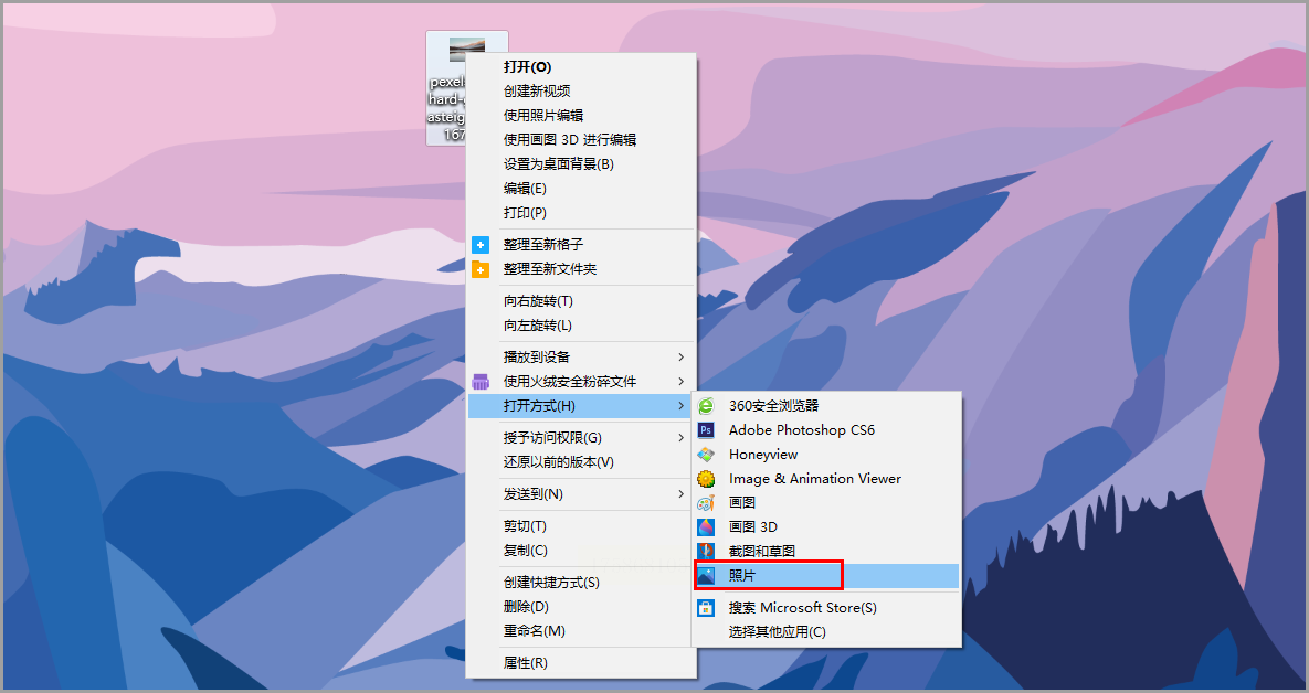 步骤二:在弹出的菜单里,选择“打开方式”,然后点击“照片”这个应用。