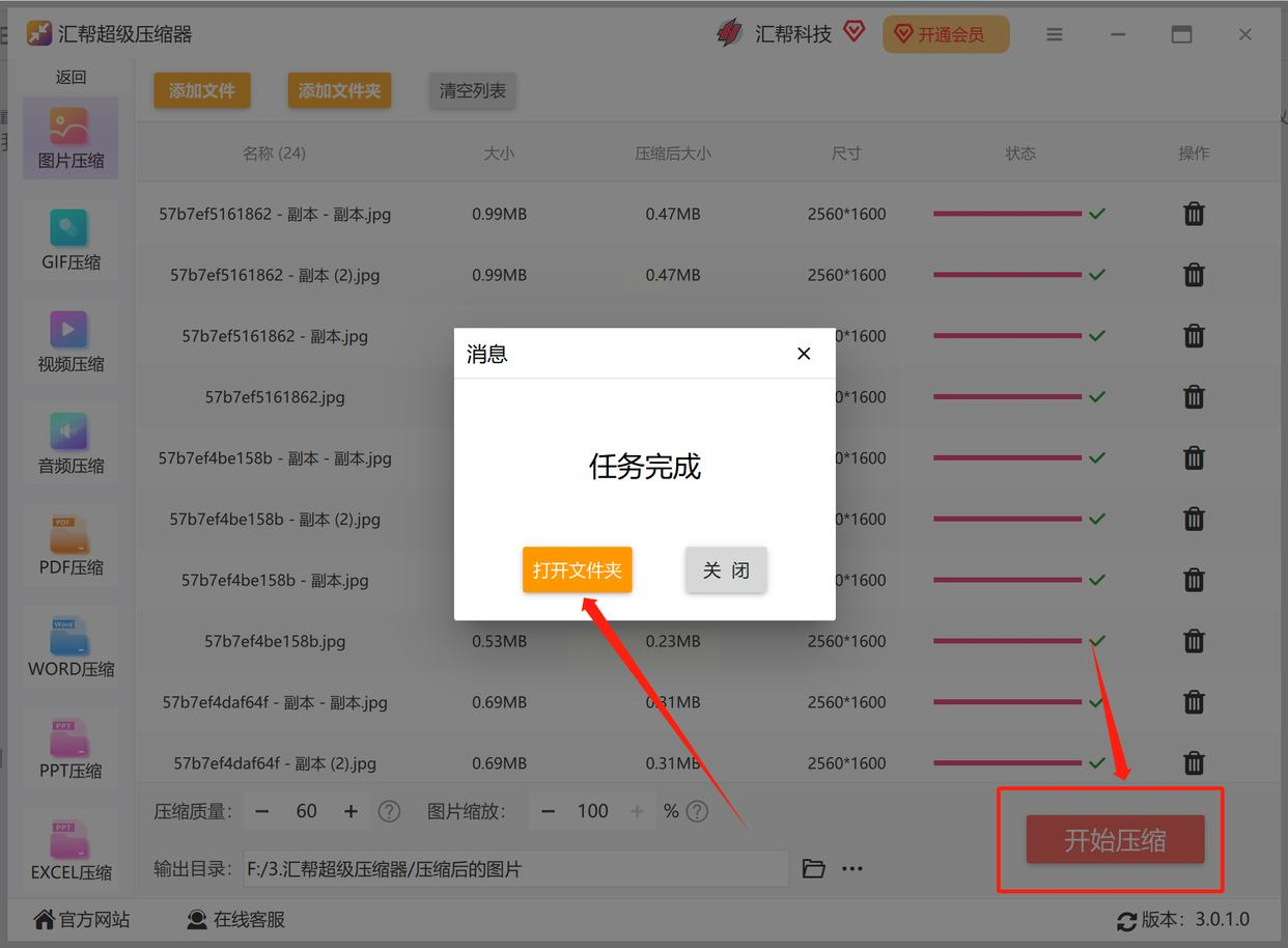 设置完就点“开始压缩”按钮,进度条会实时显示,一般几秒钟就搞定。完成后,去你设的路径看看,对比原图,你会发现文件小了一大圈,但清晰度基本没变。我常用这招处理网站素材,效率高得没话说!