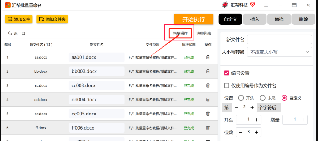 7. 最后,点击“开始执行”按钮,软件将自动开始对文件进行重命名。如果文件数量较多,可能需要等待一段时间。完成重命名后,软件会有相应的提示,您可以根据提示打开文件所在的文件夹,查看文件是否已经成功重命名,并查看每个文件后面是否添加了001,002,003......100的字样。