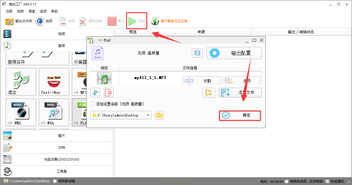 1. 选择目标格式:打开格式工厂,在左侧功能栏找到“音频”分类,点击“FLAC”选项。