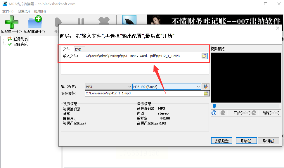 1. 导入文件:打开软件后,在“输入文件”区域点击“浏览”,选择MP3文件。