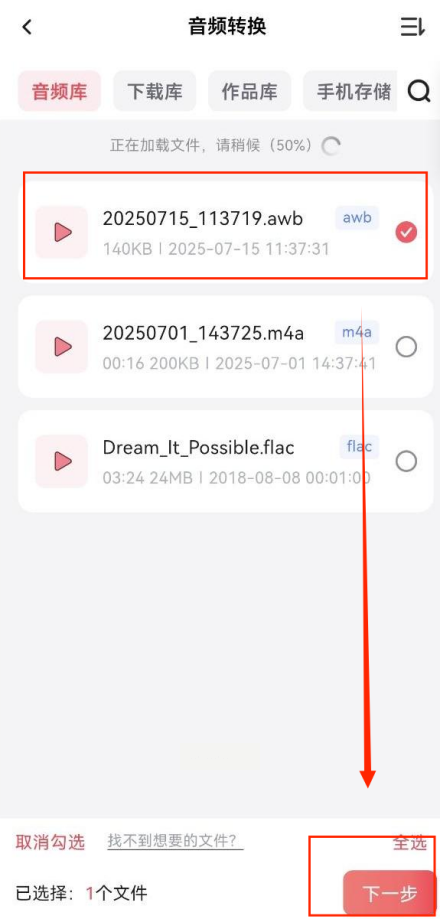 点击“格式转换”进入后,你会看到手机相册里的文件,找到要转换的AWB录音,选中它。如果文件太多,还能直接搜索文件名快速定位,超方便!