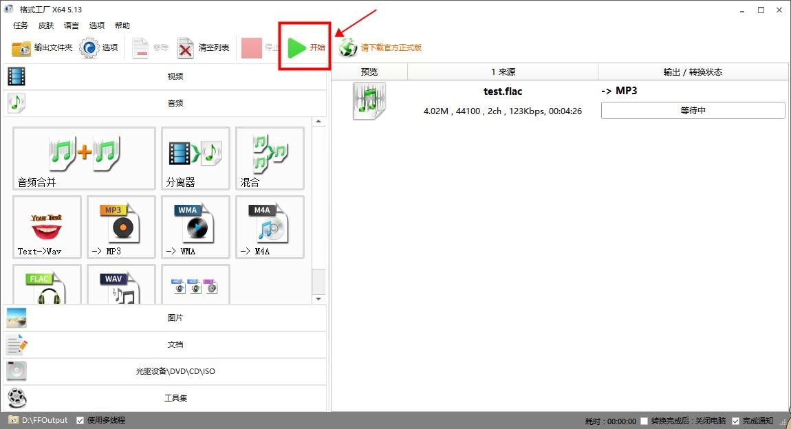 启动格式工厂后,在左侧菜单找到“音频”分类,点击展开后选择“MP3”选项(图标是个小音符)。