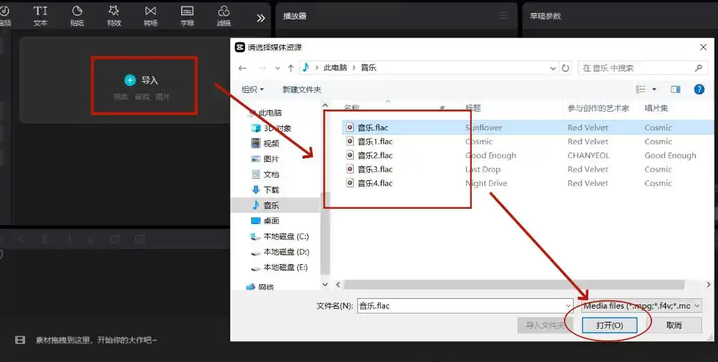 步骤二,在素材面板点击“导入”,选择你的FLAC音频文件。