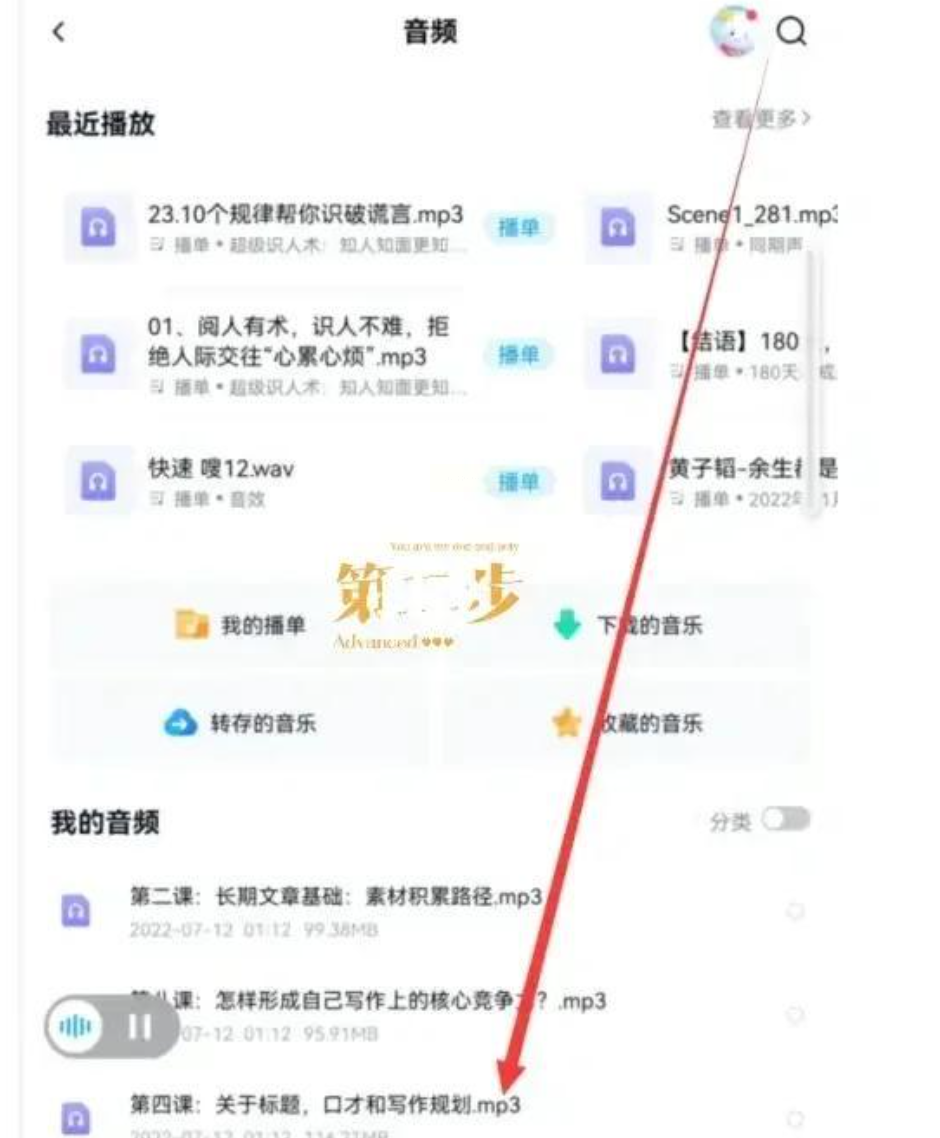 2. 在底部导航栏找到【文件】或【我的资源】,进入后找到你存好的音频文件(比如MP3格式的讲座、音乐)。