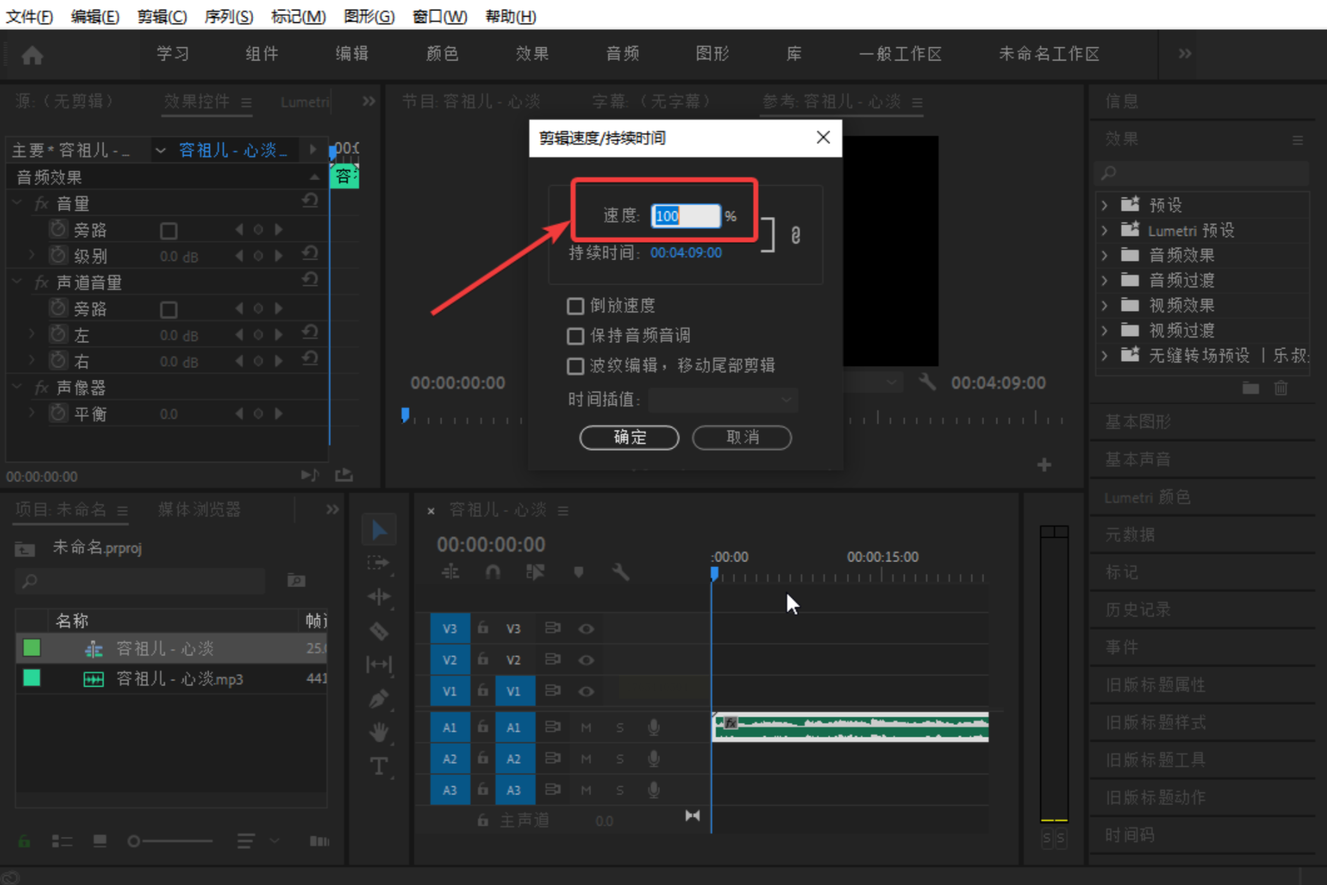 6. 这时候会跳出一个设置窗口,看到“速度”那一栏了吗?那里显示的是100%,代表原始速度。你想调快就输入大于100的数字(比如150就是1.5倍速),想调慢就输入小于100的数字(比如80就是0.8倍速)。