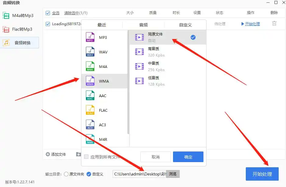 3. 配置输出:选择WMA格式,设置输出路径,点击“处理”,状态栏显示转换进度,完成后可直接打开文件。