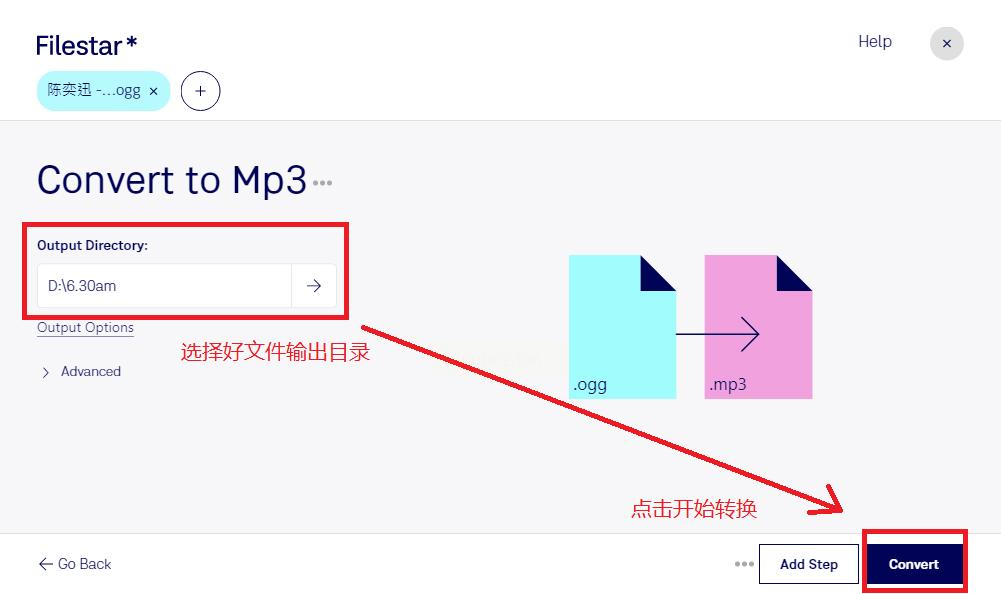 步骤二:文件上传成功后,在输出格式设置里选择“MP3”作为目标格式。