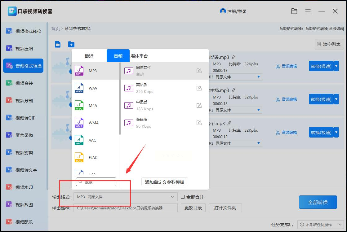 步骤四:在界面下方找到“输出格式”,点开选择“MP3”。如果有音质参数可以调整,一般用默认设置就行。