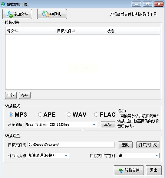 选完后,界面下方会显示文件列表,你可以在右侧直接修改输出格式,比如把FLAC改成MP3,或者反过来。
