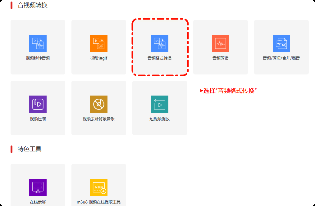 打开后选「音频格式转换」,界面简洁得像微信聊天窗口,一眼就能找到要的功能。