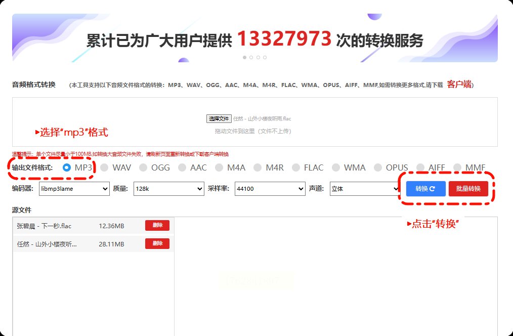 点击中间的「选择文件」按钮,从电脑里找到要转换的FLAC文件,或者直接把文件拖到网页的空白区域。上传过程中会显示进度条,文件越大上传时间越长,耐心等一下~