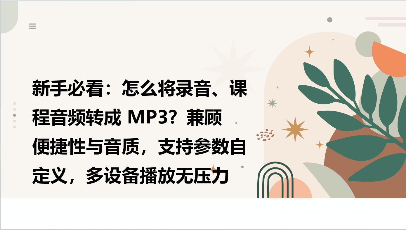 你是不是也遇到过这种情况?好不容易下载了一段重要的音频资料,或是精心录制了一段语音,结果因为格式问题,在手机、电脑或者上传平台时怎么也打不开。别着急,这几乎是每个数字时代用户的共同烦恼。音频格式的世界就像一座迷宫,WAV、FLAC、AAC……各有各的领地,但当我们想要畅通无阻地分享、播放或存储时,MP3这位“老牌通行证”总是最靠得住的伙伴。它体积小巧,兼容性几乎无处不在。今天,我们就抛开那些复杂的术语,直接上手,聊聊怎么用几种不同的工具,把你手头的音频文件,轻松变成随处可用的MP3格式。
