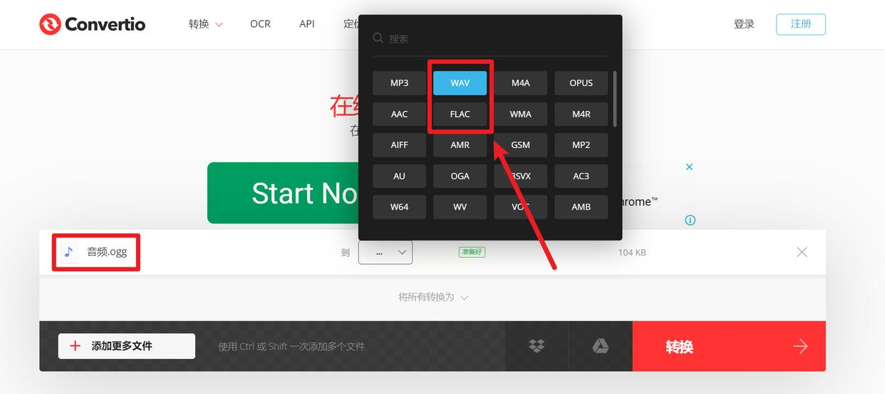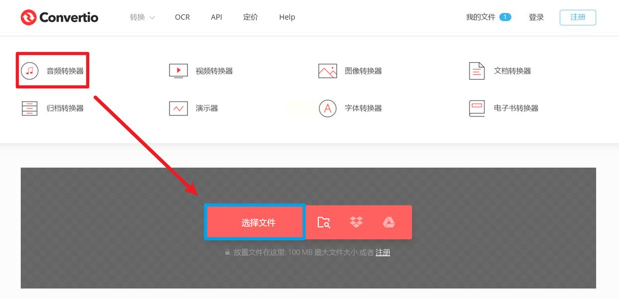 在Convertio官网首页,点击顶部导航栏“转换”选项,在下拉菜单中选择“音频转换器”,进入专业音频处理界面。