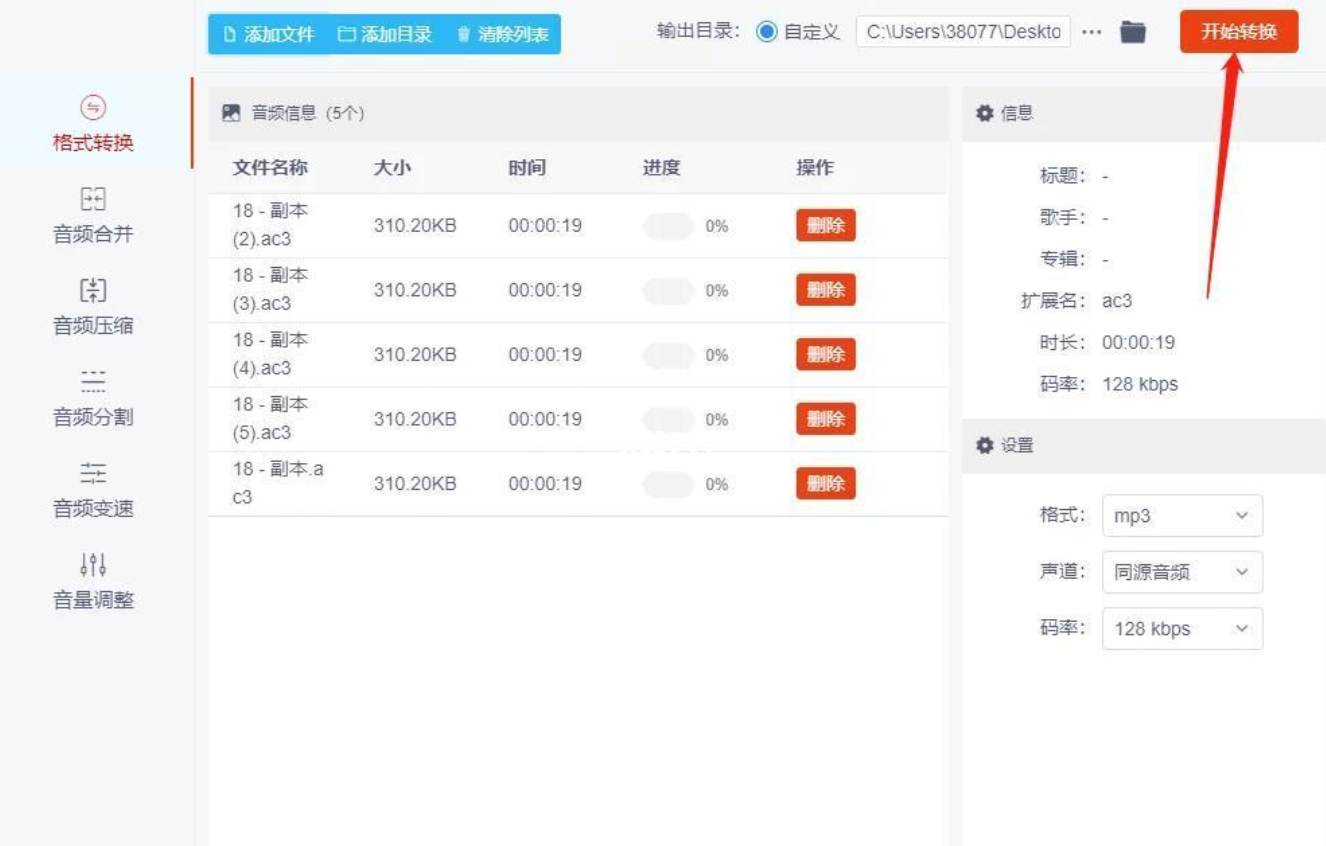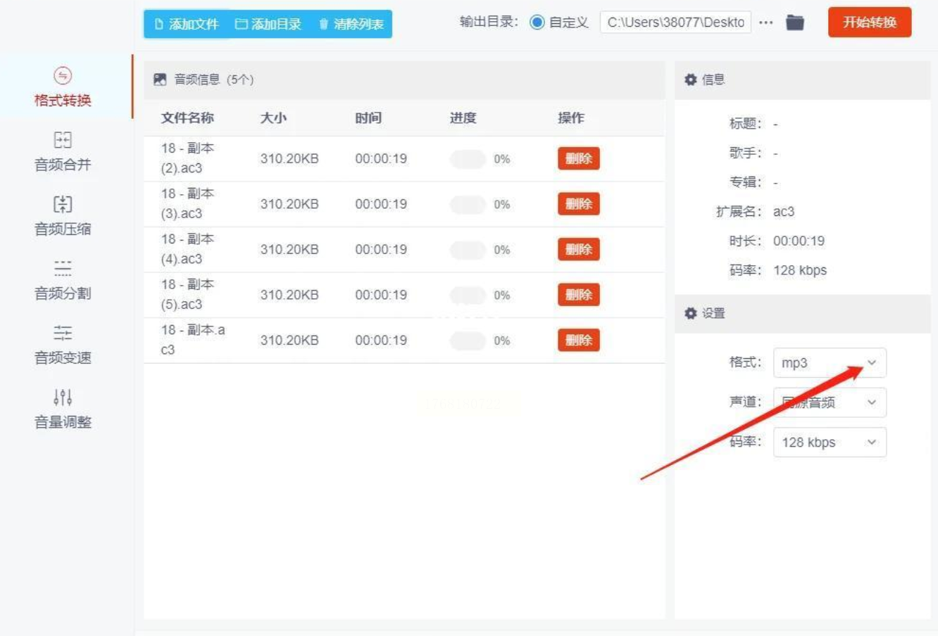 3. 确认参数:选MP3格式,比特率默认128kbps就行,然后点「开始转换」。