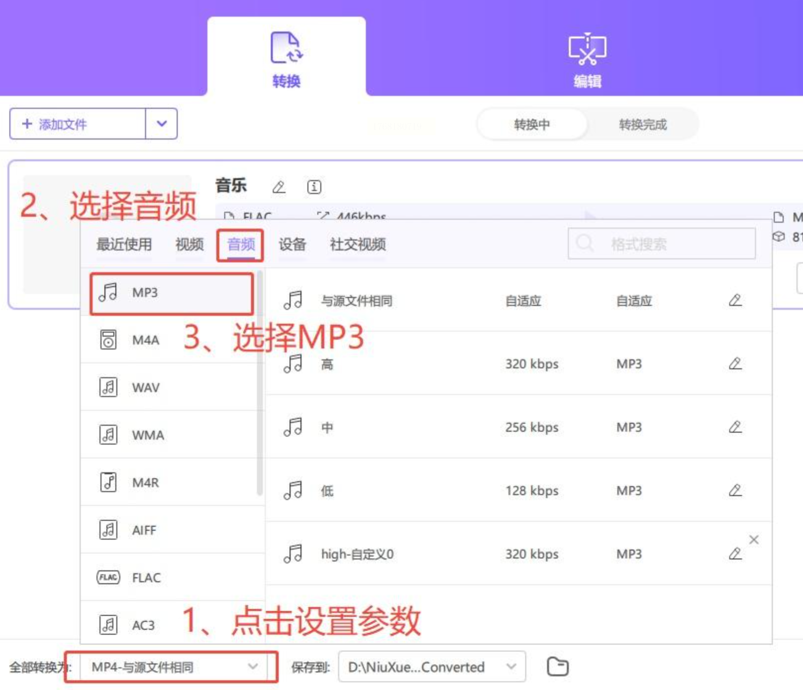 3. 改格式:右侧列表里选“MP3”,格式旁边有个小箭头,点开能选不同音质(比如“高音质”“标准音质”,看需求选)。