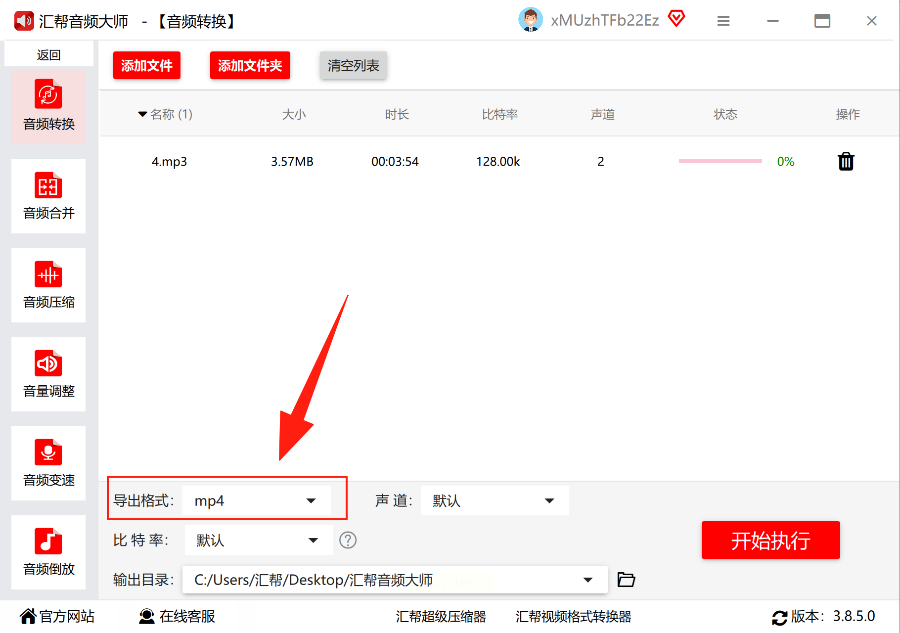 步骤三:在输出设置区域,将目标格式明确选择为“MP4”。你通常还可以对视频编码器、帧率等参数进行基础调整,不过对于单纯的音频转视频,保持默认设置一般即可。