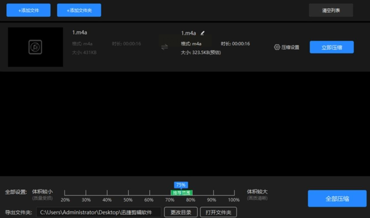 导入后,软件会自动给出压缩选项,你可以选“快速压缩”(适合大文件)或者“高质量压缩”(音质更好,文件小一点)。然后点“立即压缩”,软件就会开始处理啦~