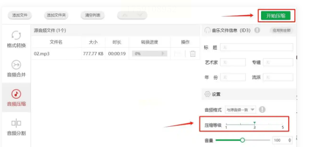 右下角有个“压缩等级”滑块,往左拉是轻度压缩(文件变小不多),往右拉是深度压缩(文件会变小很多,但音质可能会损失一点)。新手建议先拉到中间试试,觉得可以再调~