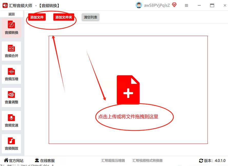 界面中间有个“添加文件”按钮,点它选你的MP3文件;或者直接把文件拖到中间的空白区域,和上面一样支持批量导入。