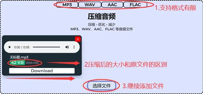 这也是一个在线压缩平台,名字就叫FreeCompress。它支持压缩多种格式的文件,音频压缩是其中一项功能。