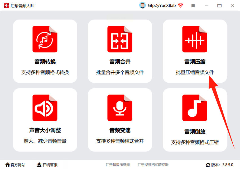 步骤一:打开安装好的《汇帮音频大师》软件。在主界面上,你可以看到“音频压缩”这个功能选项,点击它。