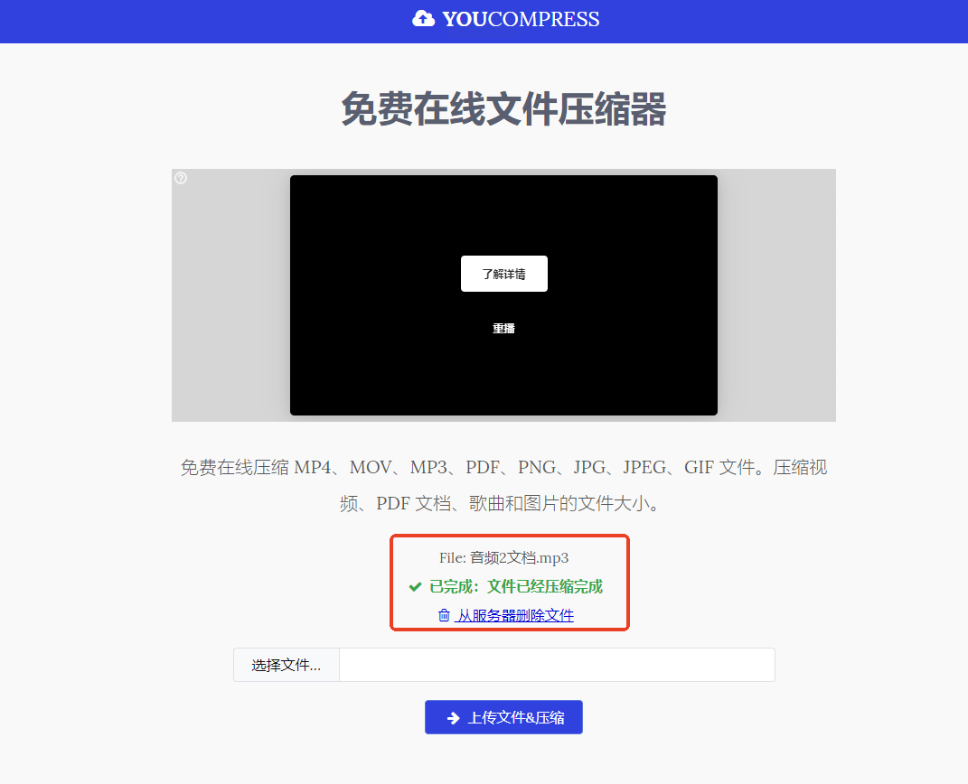 如果你不想安装任何软件,那么在线工具是个快速的选择。YouCompress就是一个专门压缩各种文件(包括MP3)的网站。它的优点是操作极其简单,打开网页就能用。