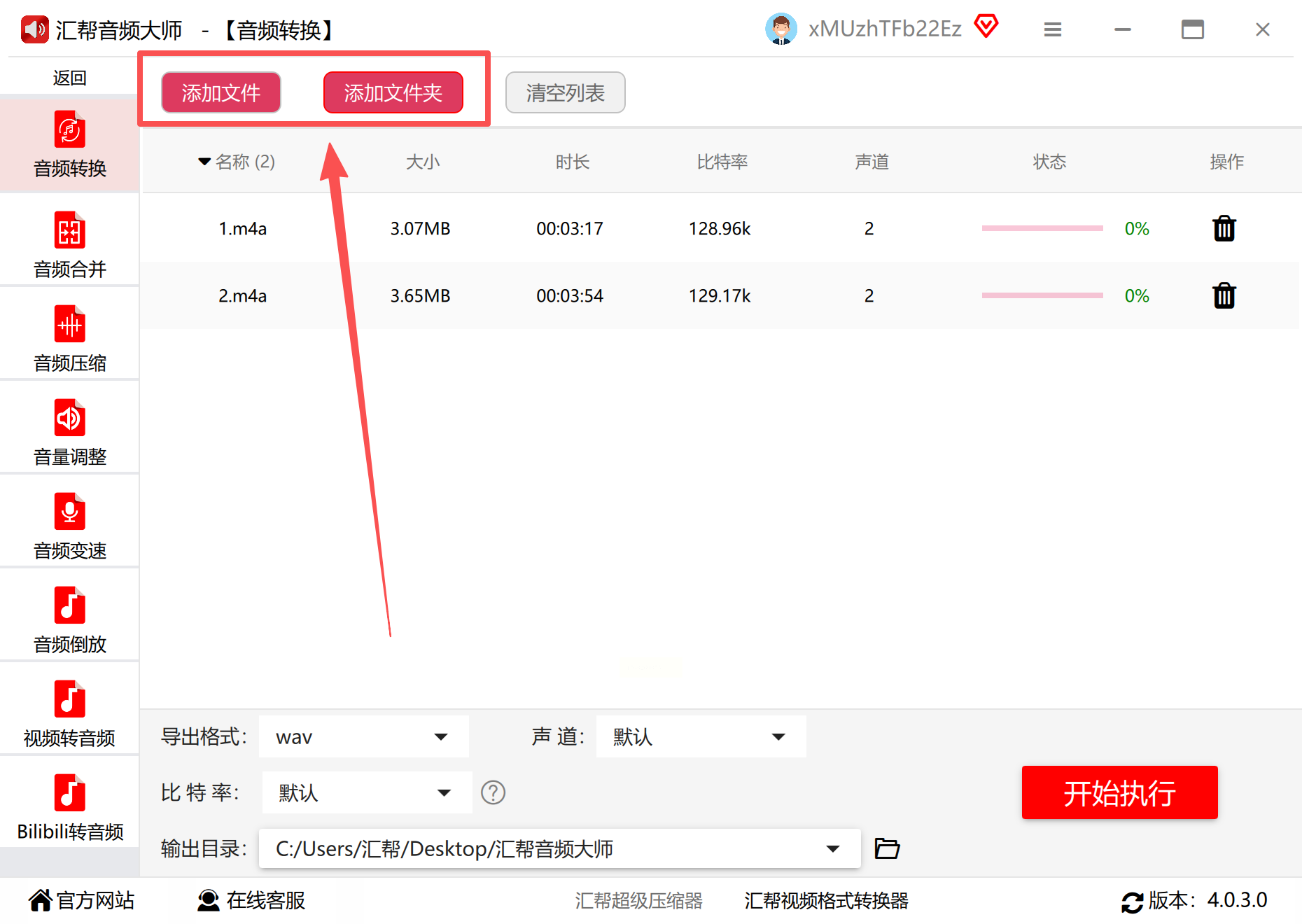 点击界面中央的“添加文件”按钮,可打开文件选择窗口导入单个或多个m4a文件;更高效的方式是直接将文件拖放到软件主界面的虚线框内,支持批量拖拽操作。对于大量文件(如100+),软件会自动按文件顺序生成任务队列,显示预计总处理时长。