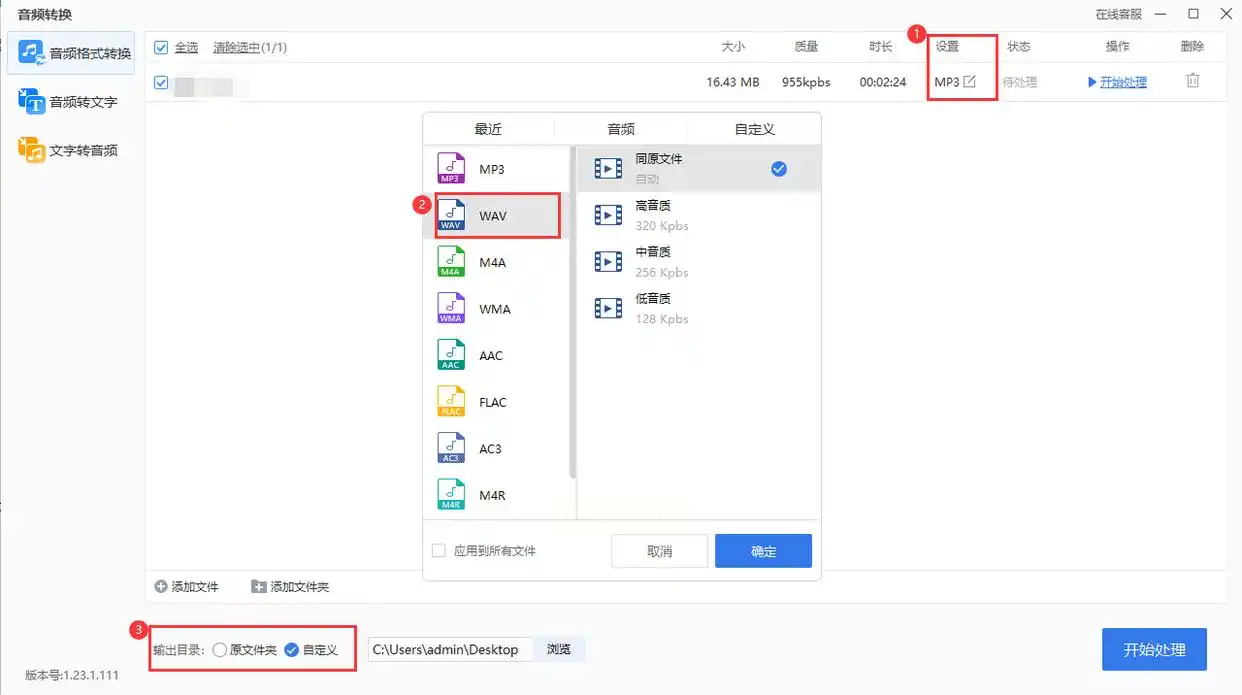 - 比特率:推荐选择128kbps(基础音质)、192kbps(中等音质)或320kbps(高保真音质),数值越大音质越接近原始文件。