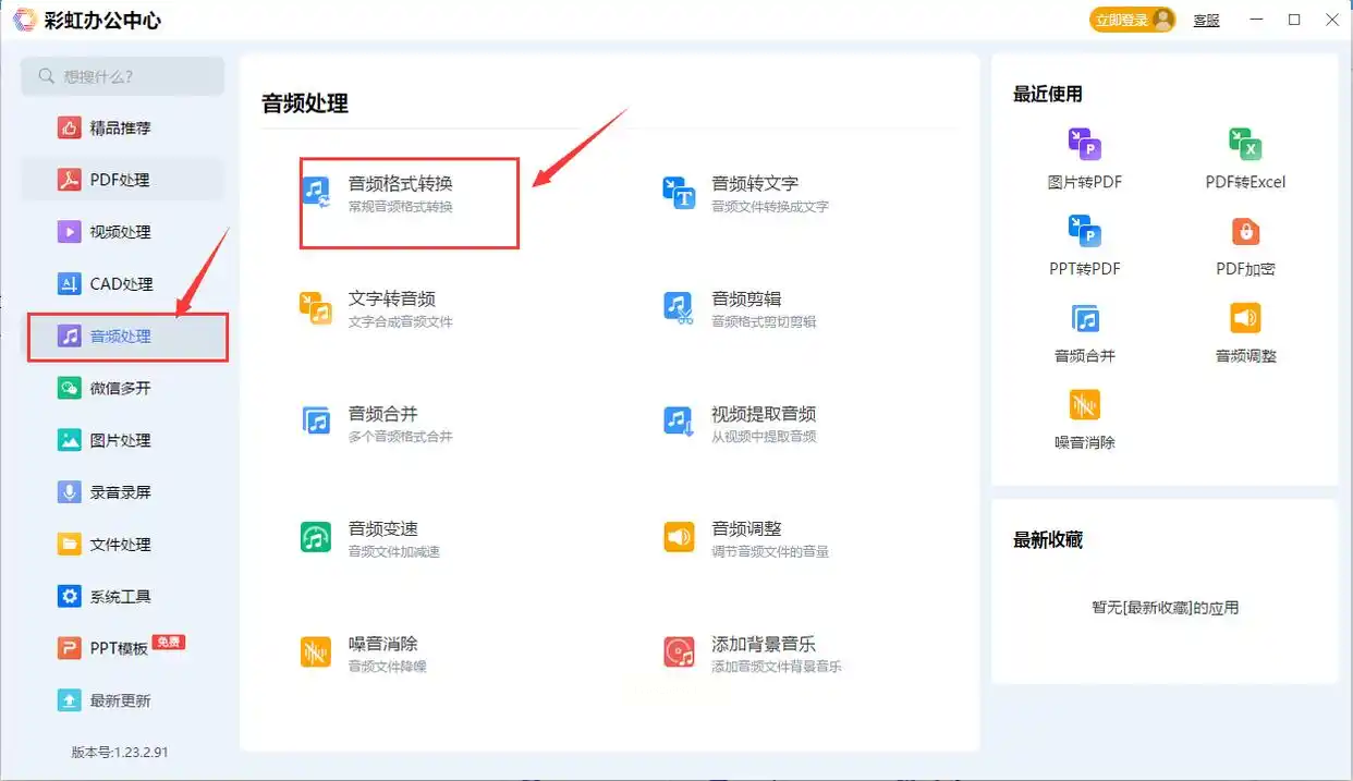 启动软件后,在主界面选择“音频格式转换”分类。与其他工具不同,该模块左侧提供格式分类导航(如“音频”“视频”“图像”),中间显示功能流程图。