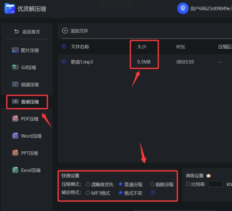 通过“添加文件”按钮,或者更直接的,把音频文件拖进软件窗口。下面通常有几个压缩模式给你选,比如“普通压缩”(平衡大小和质量)和“极限压缩”(体积最小,但音质损失可能较大)。根据你的需要选一个。