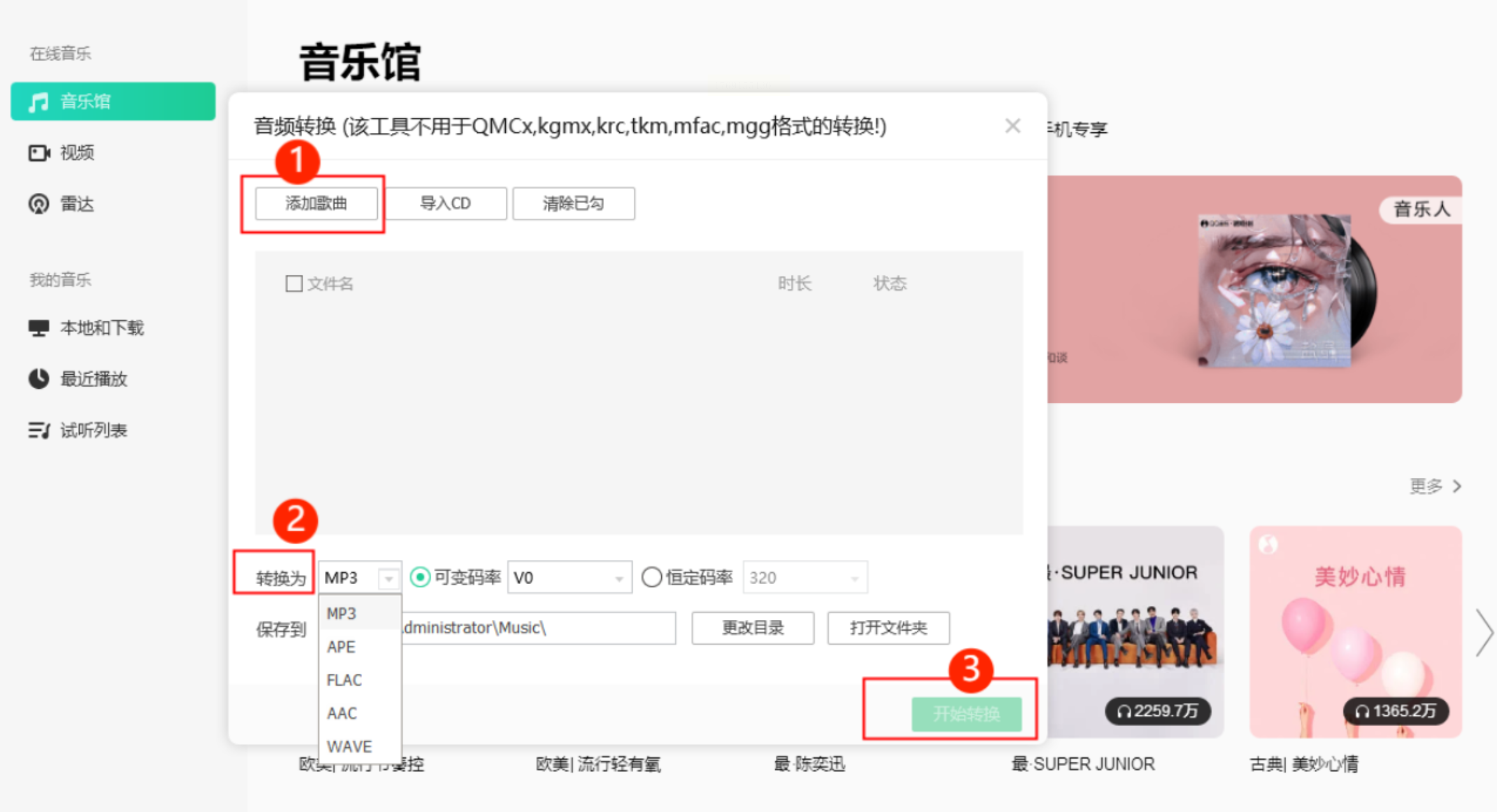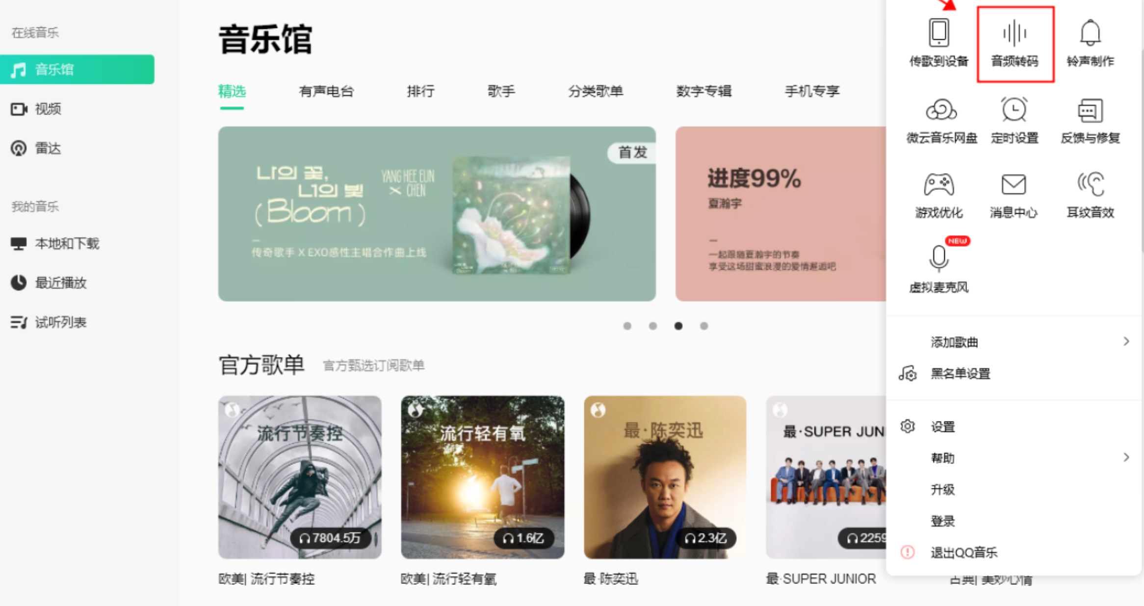 启动电脑版QQ音乐,在主界面右上角的菜单或工具箱里找到“音频转码”功能。点击“添加歌曲”导入你的OGG文件,然后在输出格式的下拉菜单中稳稳地选中“MP3”,最后点击“开始转换”按钮,软件就会在后台为你处理好一切。