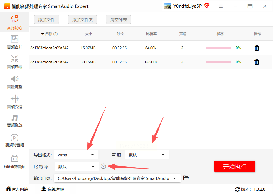 上传文件后,界面会自动显示音频信息。在“导出格式”下拉菜单中选择“WMA”,系统提供单声道/双声道、比特率(建议保持默认或选128kbps以上)等参数设置。如果对格式细节不熟悉,保持默认选项即可获得较好效果。