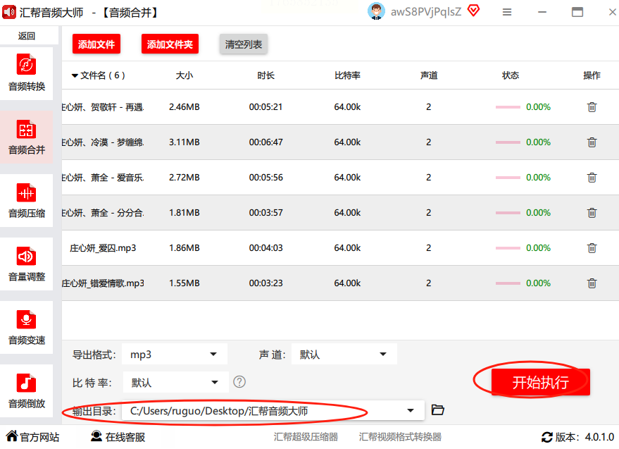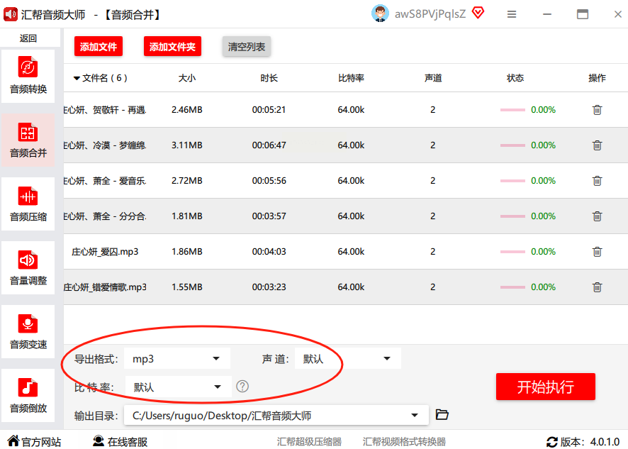 第四步:选个导出的文件夹,比如桌面或者专门建个“合并音频”的文件夹,然后点“开始执行”,等进度条走完就OK啦!合并成功后会自动弹出文件夹,你直接找到文件就能用了。