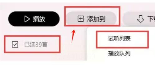 在批量操作菜单中选择“添加到”→“试听列表”,系统会生成一个临时播放列表,所有选中歌曲按顺序复制到试听列表中。