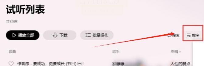 切换到“试听列表”标签,点击列表顶部的【排序】按钮(三横线图标),选择“按添加时间倒序”。此时原列表中最后添加的歌曲会变成第一首,播放时即实现了整体倒序效果。