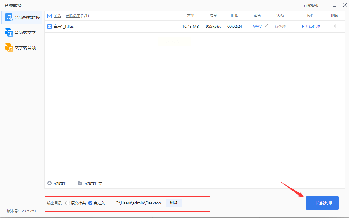 3. 格式选择:在右侧“输出格式”栏选择“WAV”,软件默认保留原采样率,若需调整可点击“高级设置”