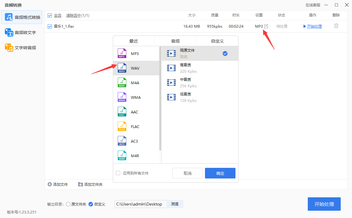 2. 格式设置:在输出格式下拉框选择“WAV”,可在“质量”选项中选择“无损”