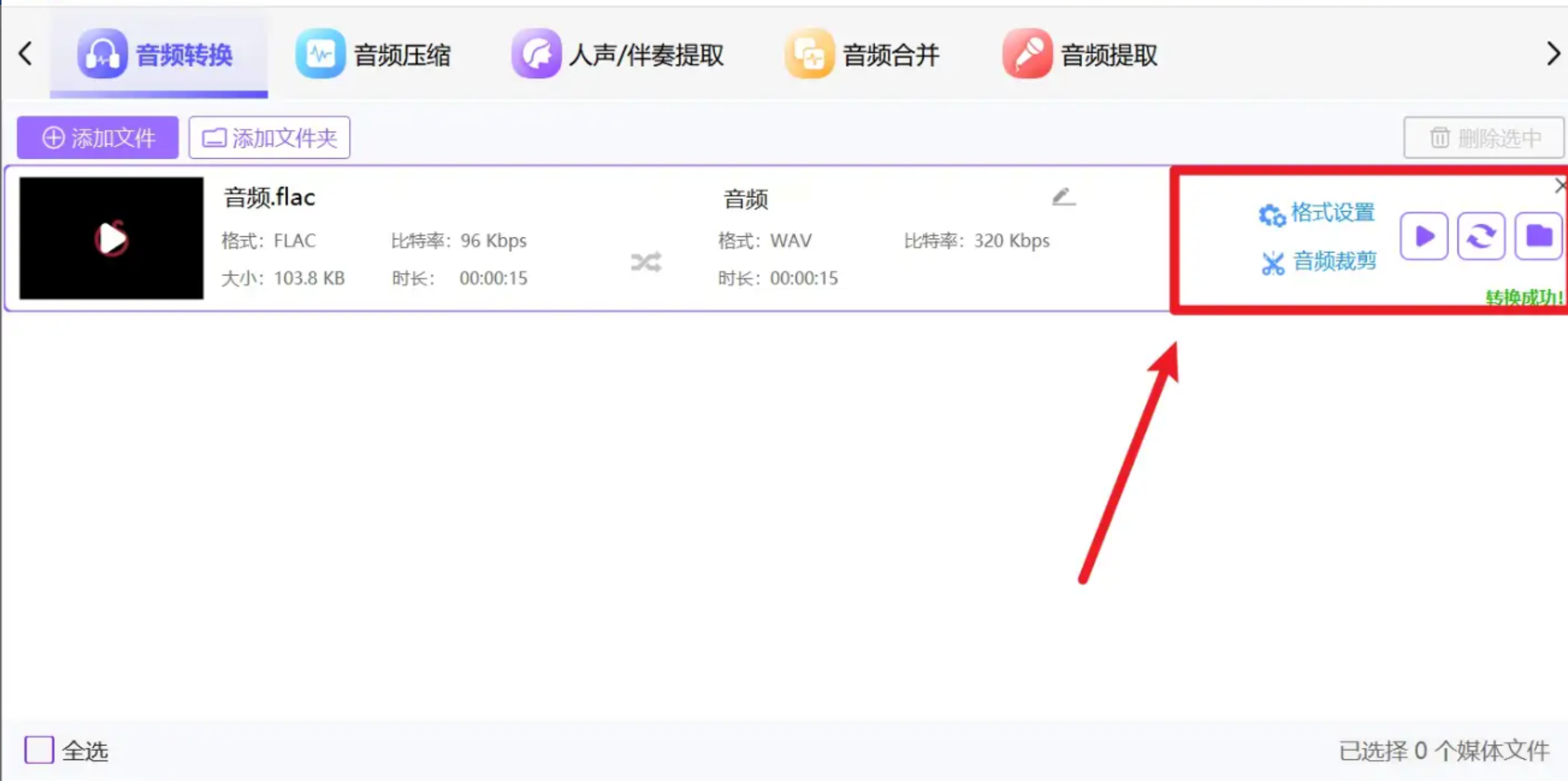 1. 添加文件:打开软件后点击“音频转换”按钮,选择“添加文件”导入FLAC文件