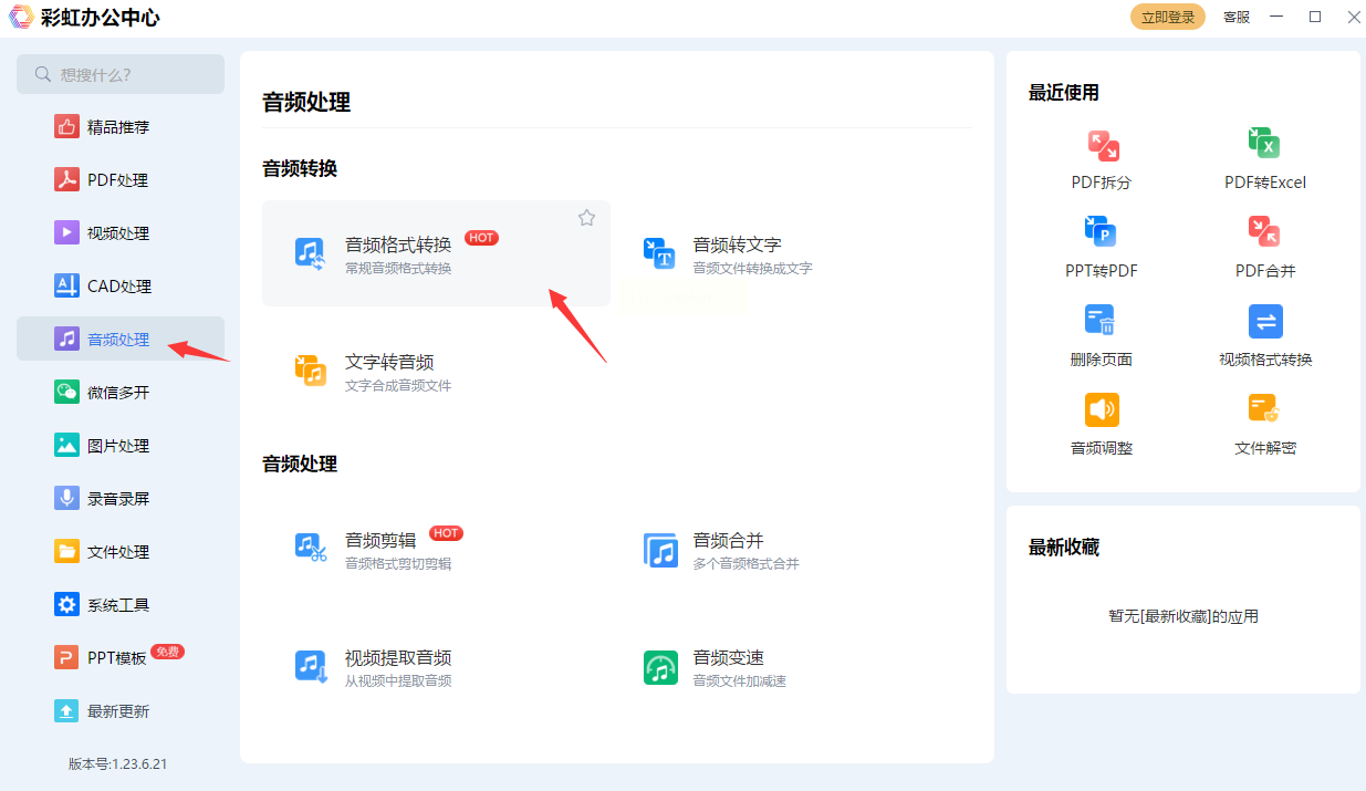 1. 进入音频处理:打开彩虹办公软件,在左侧功能区选择“音频处理”→“音频格式转换”