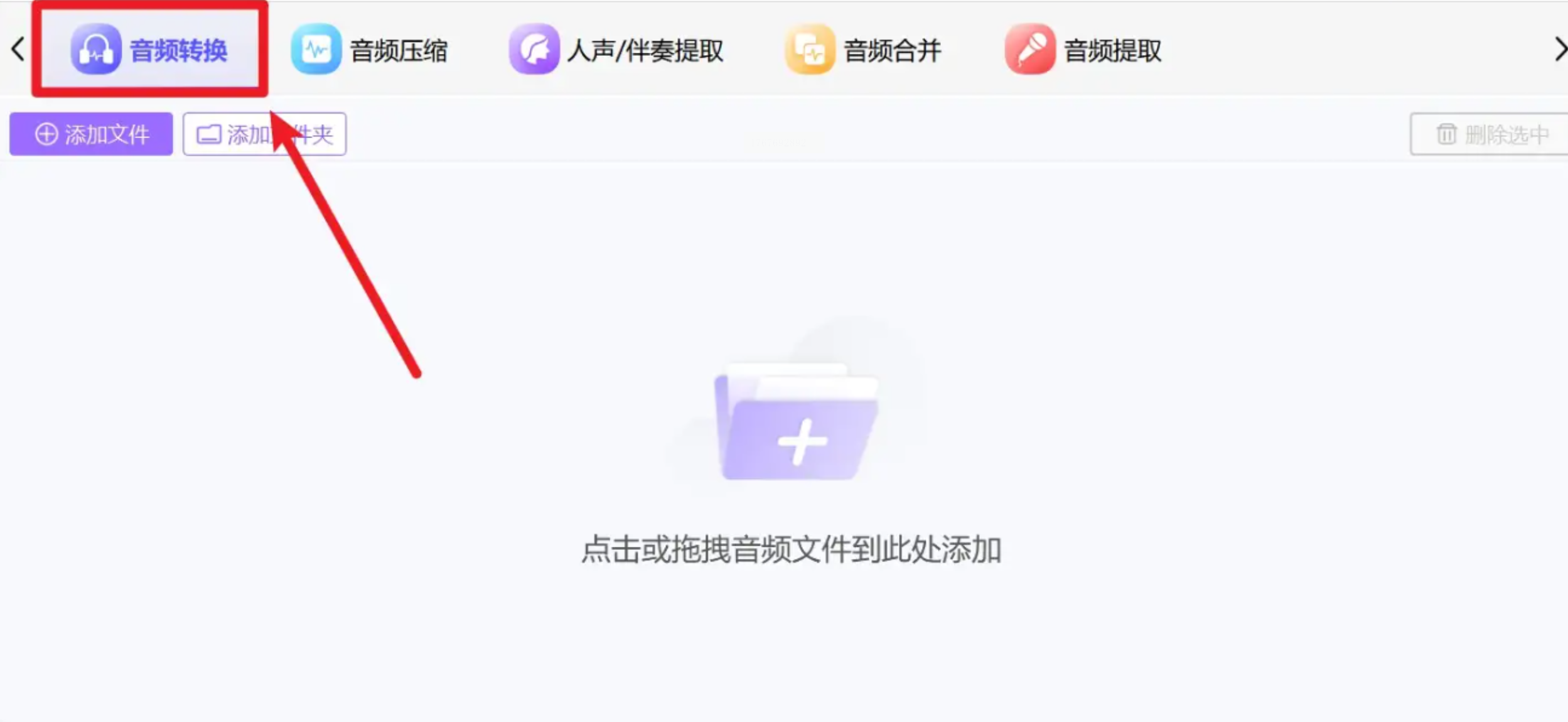 1. 进入转换模块:打开软件后点击左侧“音频转换”功能,主界面分“输入区”和“输出区”