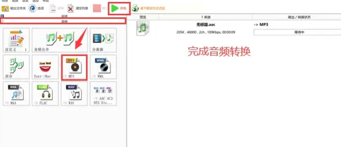 5. 开始转换:在主界面中找到转换任务列表,选中需要转换的AAC文件任务,点击界面上方的绿色三角“开始”按钮。转换过程会显示进度条,完成后会提示“转换完成”,源文件会保留在原位置。