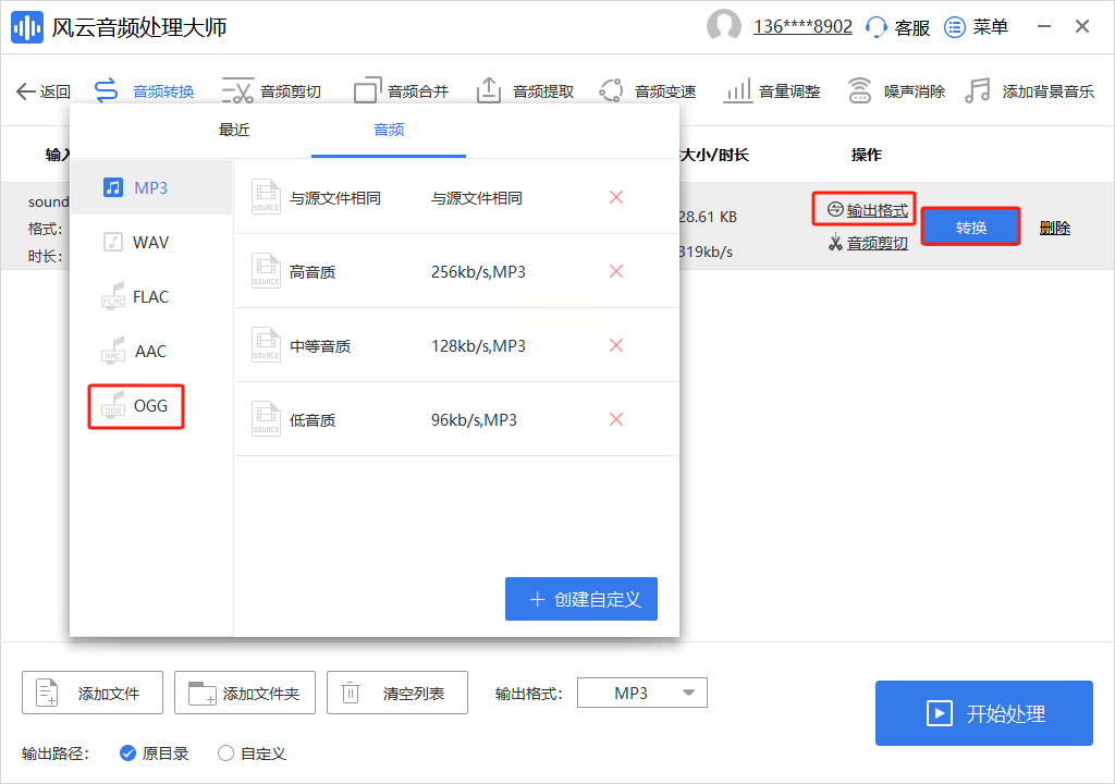 3. 输出设置:在“输出格式”列表中选择“OGG”,并通过“音频质量”滑块调整比特率(128kbps/192kbps/320kbps)。