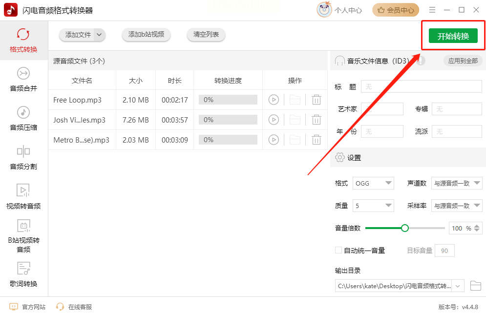 3. 设置输出参数:在格式选项中选择“OGG”作为输出格式,系统提供比特率调节滑块(通常320kbps为高音质标准),根据需求选择合适数值。