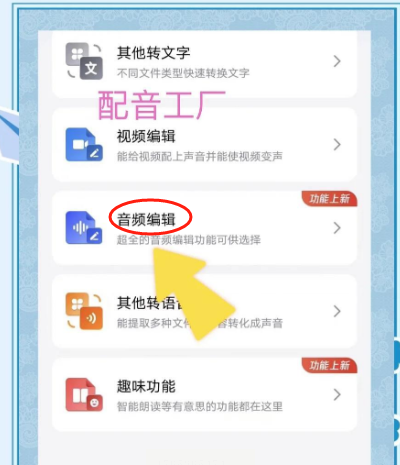 打开“配音工厂”APP,在它的主菜单或工具页里,找到“音频编辑”或类似的功能区。