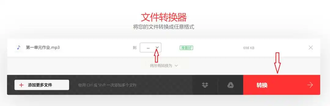 步骤三:文件上传后,在右侧下拉框选择【MP3】格式,点击右下角【转换】按钮。